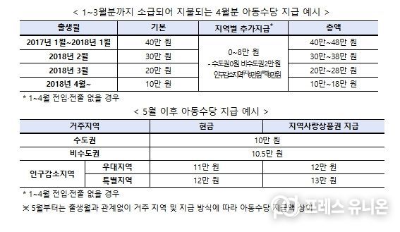 정부는 3월 20일 개정 '아동수당법' 공포 이후 아동수당 지급 연령 확대와 지역별 추가 지급을 위해 시스템을 개선했고, 문자·우편 등으로 아동수당 지급이 중단된 2017년 1월생 ~ 2018년 3월생 아동의 지급정보를 확인하여 별도의 신청 없이 지급하기 위한 절차를 진행했다.