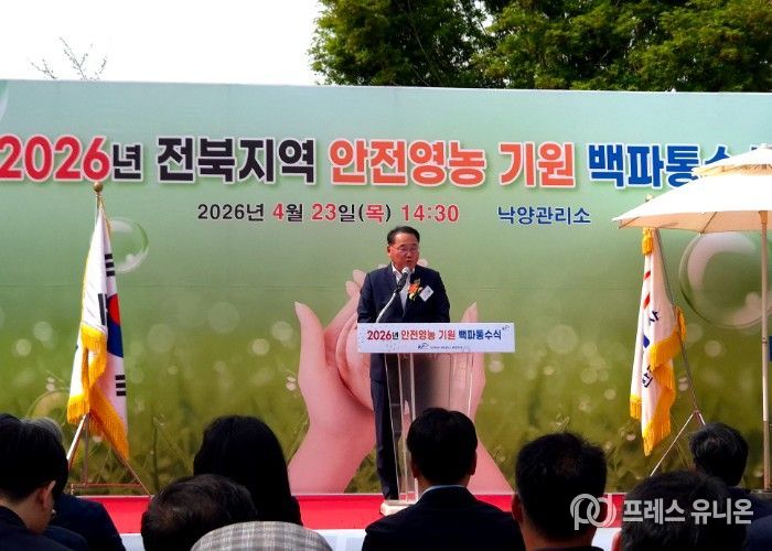 도는 23일 정읍시 태인면 낙양관리소에서 ‘2026년 안전영농기원 통수식(백파제)’을 개최했다. 이날 행사에는 김종훈 경제부지사를 비롯해 한국농어촌공사 관계자, 전북 농업인단체연합회장 등 100여 명이 참석해 풍년 농사와 안전한 영농을 기원했다.