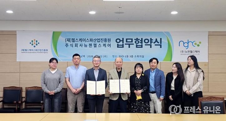 프레스유니온 강찬희 기자 | (재)헬스케어스파산업진흥원은 지난 4월 22일, 주식회사 뉴젠헬스케어와 헬스케어 및 바이오 소재의 연구개발과 사업화 협력을 위한 업무협약(MOU)을 체결했다고 밝혔다.
