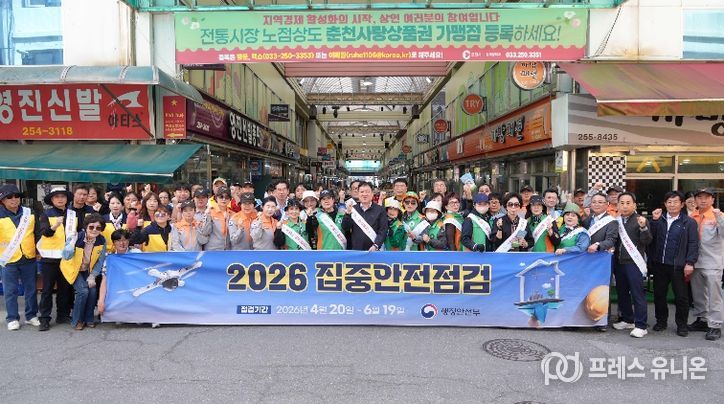 프레스유니온 강찬희 기자 | 춘천시와 춘천소방서, 한국전기안전공사, 강원도시가스 등 관계기관이 23일 중앙시장 일원에서 ‘2026년 집중안전점검 및 안전점검의 날’ 합동 캠페인을 실시했다.
