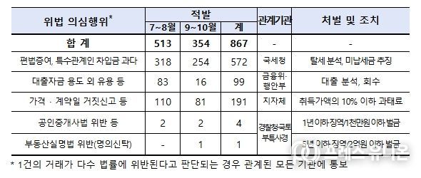 이번 기획조사는 대출규제 강화, 토지거래허가구역 확대 등 시장 안정화 대책이 본격적으로 실행됨에 따라, 편법 대출·증여나 토지거래허가 위반 등 시장질서를 교란하는 이상거래가 확대될 우려에 대비하여 서울 및 경기 일부지역(6곳)에 한정했던 ’25.1월~6월 조사와 달리 해당 지역 외에 경기 9곳을 추가 확대하여 ‘25.7월 ~ 10월 거래 신고분에 대해 실시했으며,이상거래 총 2,255건을 조사하여 위법 의심거래 746건(위법의심행위 867건)을 적발했다.