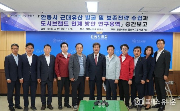 프레스유니온 강찬희 기자 | 안동시의회 문화복지정책연구회는 23일 안동시의회 회의실에서‘안동시 근대유산 발굴 및 보존 전략 수립과 도시브랜드 연계 방안 연구용역’중간보고회를 개최하고, 연구 추진 현황을 점검하는 한편 향후 정책 방향에 대해 논의했다.