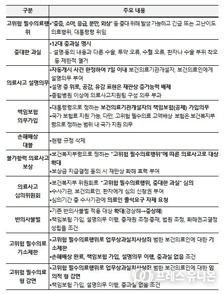 불가항력 의료사고 보상 대상을 기존 분만사고에서 ‘보건복지부령으로 정하는 고위험 필수의료행위’로 확대하여 필수의료에 대한 국가책임을 강화했다. 보상 대상인 고위험 필수의료행위의 범위·유형에 대해서는 의료계, 전문가 등과 논의하여 보건복지부령을 통해 구체화할 예정이다.