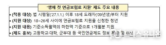 아울러 첫 보험료 지원으로 국민연금 가입자가 된 후에는 두루누리 보험료 지원, 저소득 지역가입자 보험료 지원, 실업크레딧 등 다양한 지원 제도의 혜택을 받을 수 있다.