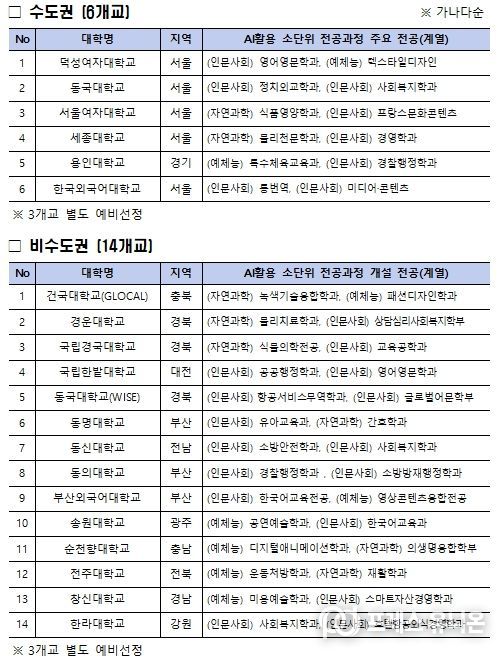 선정 대학은 인공지능(AI)의 윤리적 활용과 비판적 사고 등 인공지능(AI) 전반에 대한 ‘기초 교양 교과’와, 인공지능(AI)을 비공학계열 전공에 활용하는 ‘인공지능(AI) 활용 소단위 전공 과정’을 개발·운영하게 된다. 또한, 학습자에게 양질의 인공지능(AI) 교육을 제공할 수 있도록 교수자 역량 강화와 관리 체계 구축도 병행 추진한다. 개발된 교육과정을 타 대학과 공유하고, 대학 현장 전반에 인공지능(AI) 교육의 확산을 도모한다.