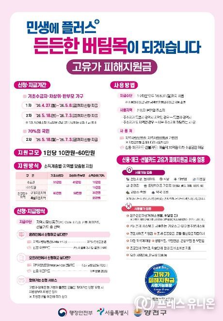프레스유니온 강찬희 기자 | 양천구가 중동 전쟁에 따른 고유가·고물가로 어려움을 겪는 구민의 경제적 부담을 완화하기 위해 ‘고유가 피해지원금’ 전담 추진단을 구성하고 27일부터 지급 절차를 시작한다고 밝혔다.