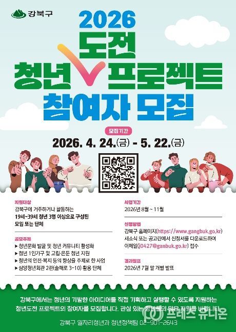 프레스유니온 강찬희 기자 | 서울 강북구는 청년들의 창의적인 아이디어를 지역사회에서 실현할 수 있도록 돕는 ‘2026년 청년도전 프로젝트’ 참여자를 모집한다고 밝혔다.