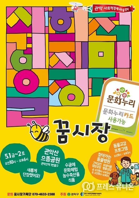 프레스유니온 강찬희 기자 | 관악구가 오는 5월 1일과 2일 양일간 관악산 으뜸공원에서 사회적경제장터 ‘꿈시장’과 ‘찾아가는 동물병원’을 함께 개최해 봄나들이객을 반기는 풍성한 콘텐츠를 선보인다.