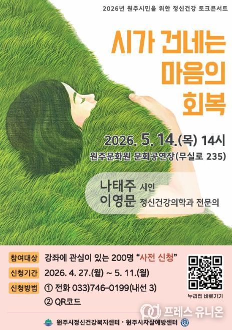 프레스유니온 강찬희 기자 | 원주시정신건강복지센터는 다음 달 14일 원주문화원 문화공연장에서 ‘시가 건네는 마음의 회복’을 주제로 정신건강 토크콘서트를 개최한다.