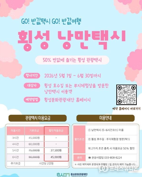 프레스유니온 강찬희 기자 | 횡성군과 횡성문화관광재단이 운영하는 횡성 낭만택시가 오는 5월 1일부터 6월 30일까지 이용요금 50% 할인 행사를 실시한다고 밝혔다.