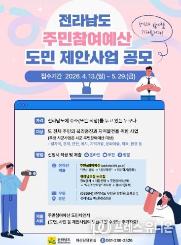 프레스유니온 강찬희 기자 | 전라남도는 2027년 예산 편성을 위한 주민참여예산 제안사업 공모를 5월 29일까지 진행한다고 밝혔다.