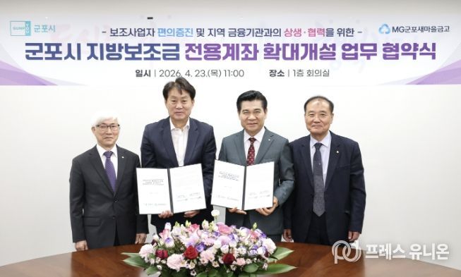 프레스유니온 김성길 기자 | 군포시는 지방보조금 전용계좌 개설 금융기관을 기존 시 금고인 NH농협은행에 더해 새마을금고까지 확대하기 위한 업무협약을 23일 체결했다고 밝혔다.