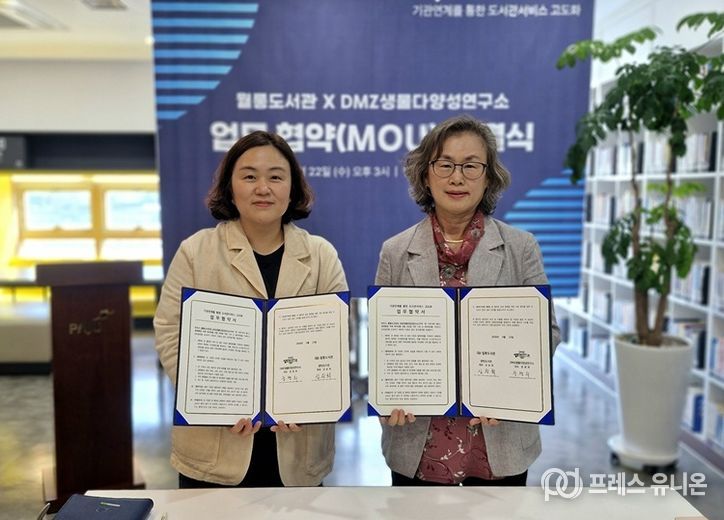 프레스유니온 김성길 기자 | 파주시 월롱도서관은 지난 22일 디엠지(DMZ)생물다양성연구소와 지역사회 독서진흥 및 생태환경 분야 협력을 위한 업무협약을 체결했다.