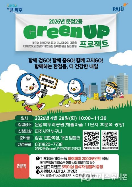 프레스유니온 김성길 기자 | 파주시 운정2동은 오는 28일 10시부터 운정 북두레공원에서 주민과 함께하는 시민 참여형 환경·건강 프로그램 ‘제3회 그린 업(Green UP) 프로젝트’를 개최한다.