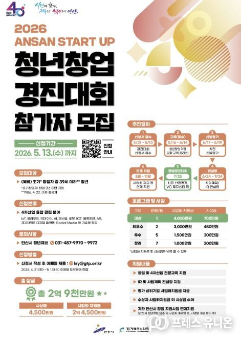 프레스유니온 김성길 기자 | 안산시는 창의적인 아이디어를 보유한 청년 창업가를 발굴하기 위해 내달 13일까지 ‘2026 안산 스타트업 청년창업 경진대회’ 참가자를 모집한다고 24일 밝혔다.