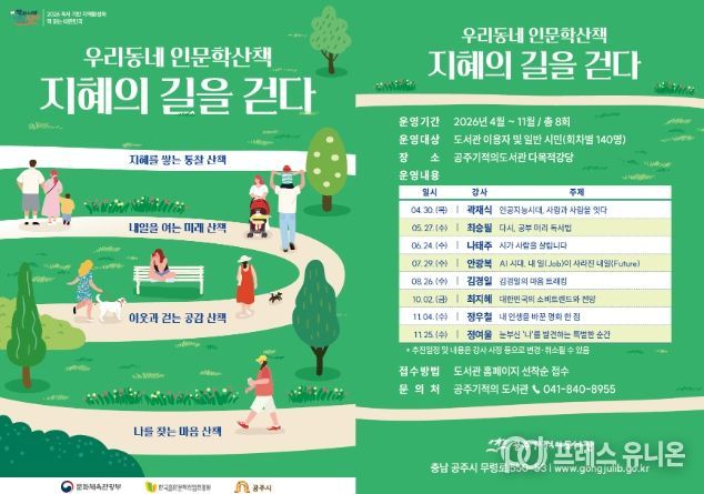프레스유니온 강찬희 기자 | 공주시는 시민의 인문학적 소양을 높이고 독서 문화를 확산하기 위해 ‘우리 동네 인문학 산책 : 지혜의 길을 걷다’ 프로그램을 본격 운영한다고 밝혔다.
