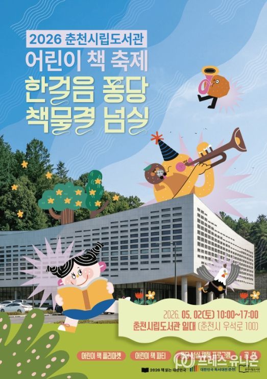 프레스유니온 강찬희 기자 | 춘천시립도서관이 오는 5월 2일 오전 10시부터 오후 5시까지 도서관 내·외부 일원에서 2026 어린이 책축제 ‘한 걸음 퐁당, 책 물결 넘실’을 개최한다.