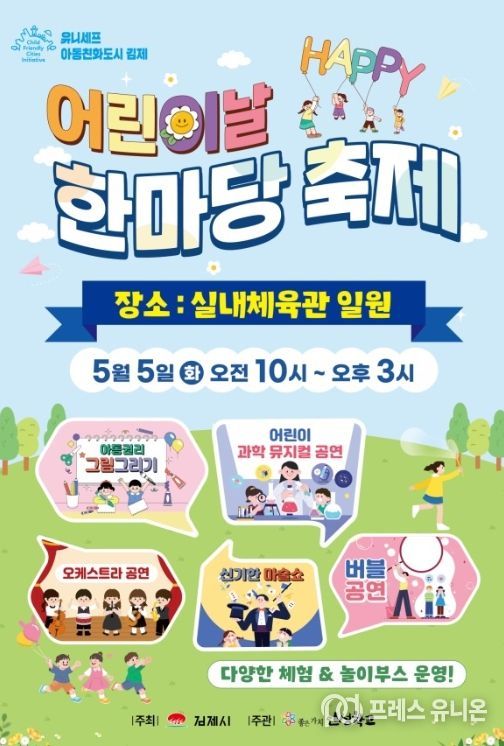 프레스유니온 강찬희 기자 | 김제시(시장 정성주)는 제104회 어린이날을 맞아, 오는 5월 5일(화) 실내체육관 주차장 일원에서 어린이날 한마당 축제를 개최한다고 밝혔다.
