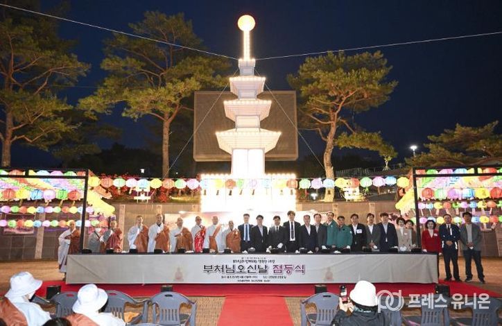 프레스유니온 강찬희 기자 | 문경시불교연합회는 불기 2570년 부처님 오신 날(5월 24일)을 앞두고 4월 23일 오후 7시 30분에 모전공원 광장에서 봉축탑 점등식을 봉행했다.