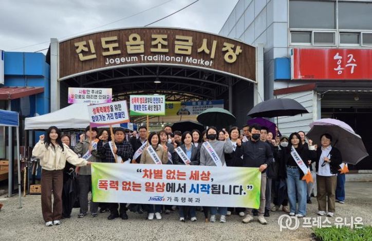 프레스유니온 강찬희 기자 | 진도군은 지난 22일 진도읍 오일장이 열리는 조금시장에서 일상에서의 차별과 편견을 줄이기 위해 ‘차별 없는 세상, 폭력 없는 일상에서 시작됩니다’를 표어로 폭력 예방 운동(캠페인)을 진행했다.