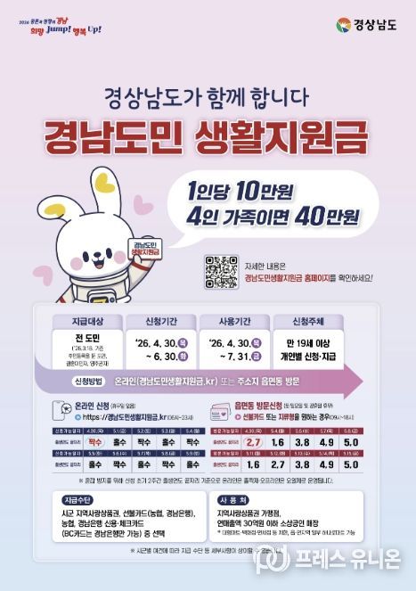 경남도민 생활지원금은 전 군민(2026년 3월 18일 주민등록 기준)을 대상으로 4월 30일부터 6월 30일까지 지급된다. 지원금액은 1인당 10만 원이며, 지급수단은 창녕사랑상품권, 신용·체크카드(농협-경남은행), 선불카드 등이다.