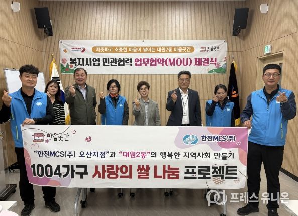 프레스유니온 김성길 기자 | 오산시 대원2동 행정복지센터와 대원2동 지역사회보장협의체는 지난 22일 한전MCS(주) 오산지점과 지역 내 취약계층 지원을 위한 복지업무협약을 체결하고, ‘1004가구 사랑의 쌀 나눔 프로젝트’ 추진을 위한 발대식을 개최했다고 밝혔다.