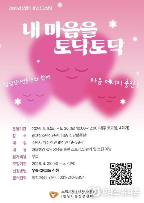 프레스유니온 김성길 기자 | 수원시청소년청년재단 청청마음건강센터는 학업과 취업준비, 직장생활 등 경쟁 중심 환경으로 인해 심리적 소진을 겪는 관내 청년들을 대상으로, 오는 5월 7일까지 전문가가 참여하는 집단상담 프로그램 ‘내 마음을 토닥토닥’ 참가자를 모집한다고 밝혔다.
