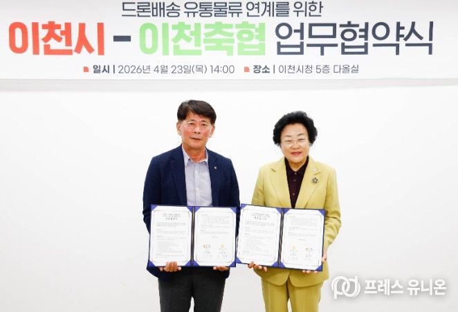 프레스유니온 김성길 기자 | 이천시는 23일 이천축산업협동조합(이하 이천축협)과 ‘드론배송 유통물류 연계를 위한 업무협약’을 체결했다.