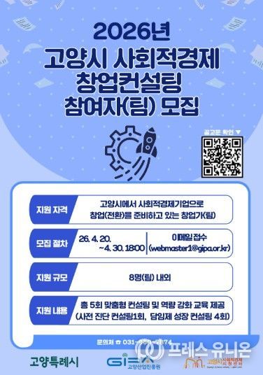 프레스유니온 강찬희 기자 | 고양산업진흥원이 운영하는 고양시사회적경제지원센터가‘2026년 고양시 사회적경제 창업컨설팅 사업’에 참여할 예비 창업자(팀)을 오는 30일까지 모집한다.