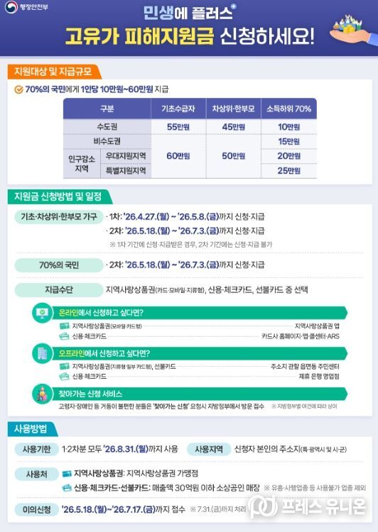취약계층을 대상으로 하는 1차 신청은 4월 27일부터 5월 8일까지이며, 소득 하위 70% 일반 가구를 대상으로 하는 2차 신청은 5월 18일부터 7월 3일까지 진행된다.