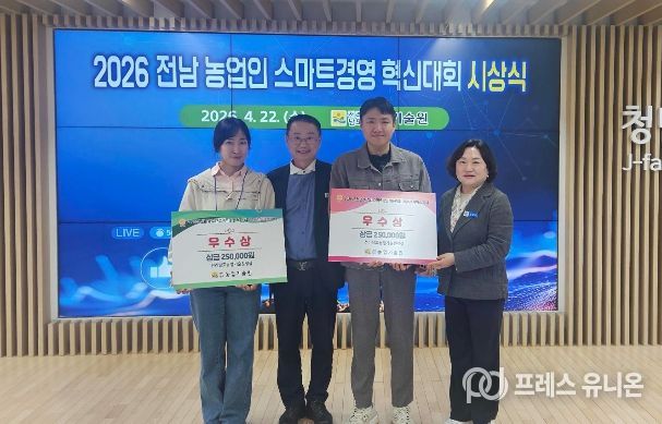 프레스유니온 강찬희 기자 | 영광군은 지난 4월 22일 전라남도농업기술원 창농타운에서 열린 ‘2026년 전남 농업인 스마트경영 혁신대회’에서 관내 청년농업인 2명이 우수상을 수상했다고 밝혔다.