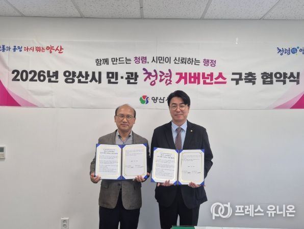 프레스유니온 강찬희 기자 | 양산시는 건축행정의 신뢰를 높이고 투명한 건축 문화를 정착시키기 위해 양산시건축사회와 ‘민·관 청렴 거버넌스 구축을 위한 업무협약’을 체결했다고 밝혔다.
