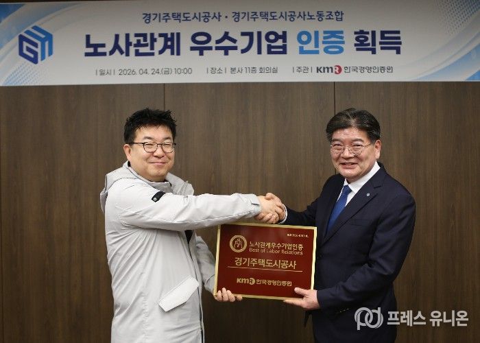 프레스유니온 김성길 기자 | 경기주택도시공사(GH)가 상호 신뢰와 존중의 건강한 노사관계 구축을 인정받아 ‘2026 노사관계 우수기업’ 인증을 최초로 획득했다고 24일 밝혔다.