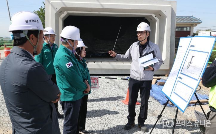 프레스유니온 김성길 기자 | 청주시는 우기를 앞두고 공사현장 안전관리를 강화하기 위해 24일 흥덕구 옥산지구 배수장 설치공사 현장을 방문해 안전점검을 실시했다.