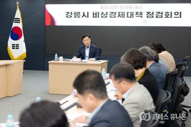 프레스유니온 강찬희 기자 | 강릉시는 24일 시청 8층 상황실에서 중동상황 장기화에 따른 유가 상승 및 원자재 수급 차질 등 지역경제 전반에 미치는 영향을 점검하고 선제적 대응 방안을 마련하기 위해 비상경제대책 점검회의를 개최했다.