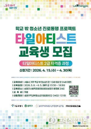 프레스유니온 강찬희 기자 | 송파구는 서울시 ‘약자와의 동행’ 공모사업으로 학교 밖 청소년들의 사회진입과 자립을 돕기 위한 ‘타일아티스트 교육’을 실시한다고 24일 밝혔다.