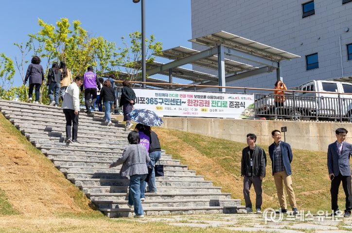 프레스유니온 강찬희 기자 | 마포구는 마포365구민센터와 한강공원을 연결하는 녹색 보행로인 ‘잔디로’를 조성하고 4월 24일 오전 준공식을 개최했다.