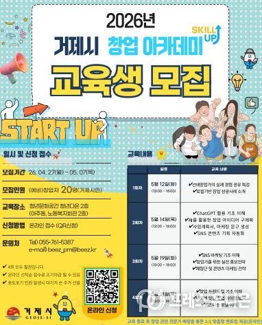 프레스유니온 강찬희 기자 | 거제시는 지역 내 예비 창업자와 일반 시민이 일상 속 아이디어를 창업 으로 구현해볼 수 있도록 돕는'2026년 거제시 창업 아카데미' 교육생을 오는 4월 27일부터 모집한다.
