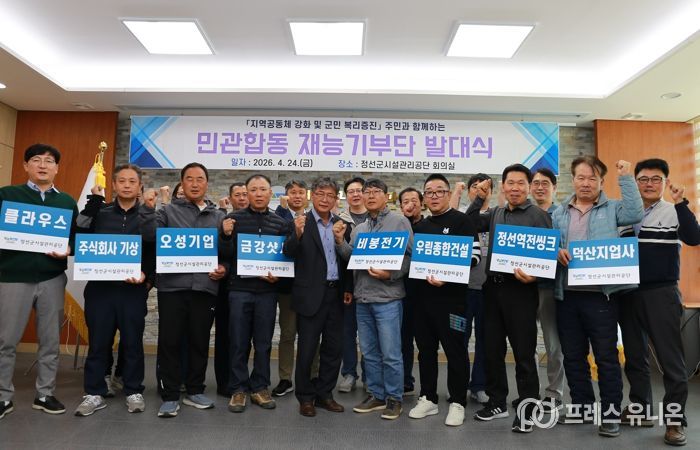 프레스유니온 강찬희 기자 | 정선군시설관리공단은 지역사회 나눔문화 확산과 군민 삶의 질 향상을 위해 '2026년 민관합동 재능기부단 발대식'을 4월 24일 공단 청사 2층 회의실에서 개최했다고 밝혔다.