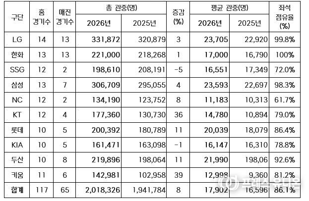 프레스유니온 강찬희 기자 | 2026 신한 SOL KBO 리그가 오늘(25일) 열린 잠실, 문학, 광주, 고척, 대전 경기에서 총 9만 9,905명이 입장하며 200만 관중을 달성했다.