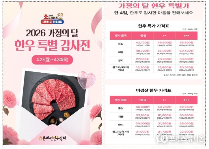 프레스유니온 강찬희 기자 | 농림축산식품부는 가정의 달을 맞아 한우자조금, 전국한우협회, 농협경제지주와 협력하여 4월 27일부터 5월 10일까지 14일 동안 농축협 하나로마트, 대형마트 및 주요 온라인몰 등에서 ‘소(牛)프라이즈 대한민국 한우고기 할인행사’를 실시한다고 밝혔다.