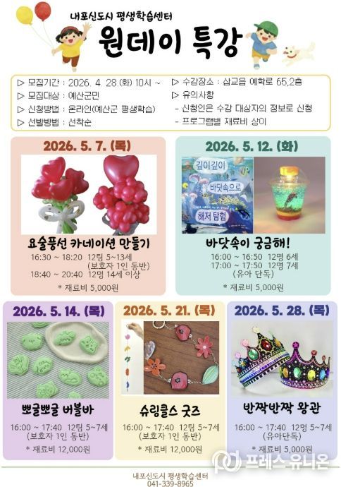 프레스유니온 강찬희 기자 | 예산군 내포신도시 평생학습센터는 5월을 맞아 지역 어린이를 위한 체험형 원데이 특강 프로그램을 운영한다.