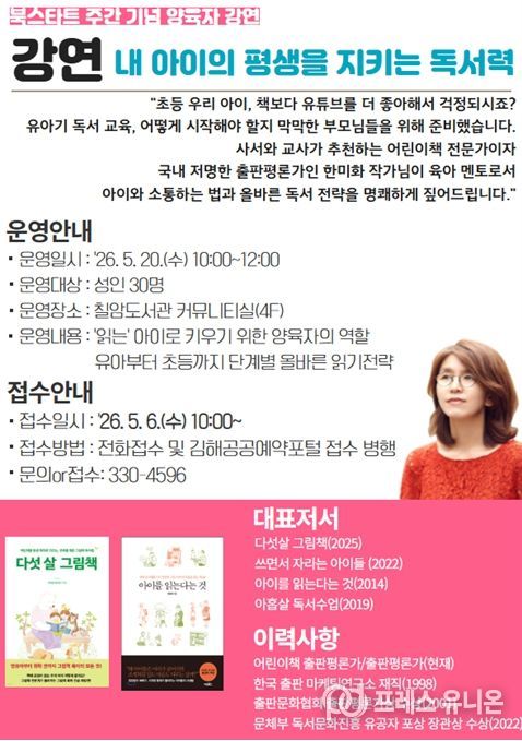 프레스유니온 강찬희 기자 | 김해시 칠암도서관은 북스타트 주간을 맞아 올바른 독서 양육의 방향을 제시하기 위해 내달 20일 ‘내 아이의 평생을 지키는 독서력’ 강연을 개최한다고 27일 밝혔다.