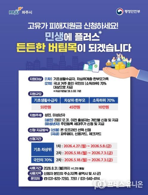 프레스유니온 김성길 기자 | 파주시는 오늘(27일)부터 시민 생활 안정을 위한 정부 추진 ‘고유가 피해지원금’1차 신청을 받는다. 이번 1차 신청 대상은 기초생활수급자, 차상위계층, 한부모가구이며, 신청 기간은 4월 27일부터 5월 8일까지다.