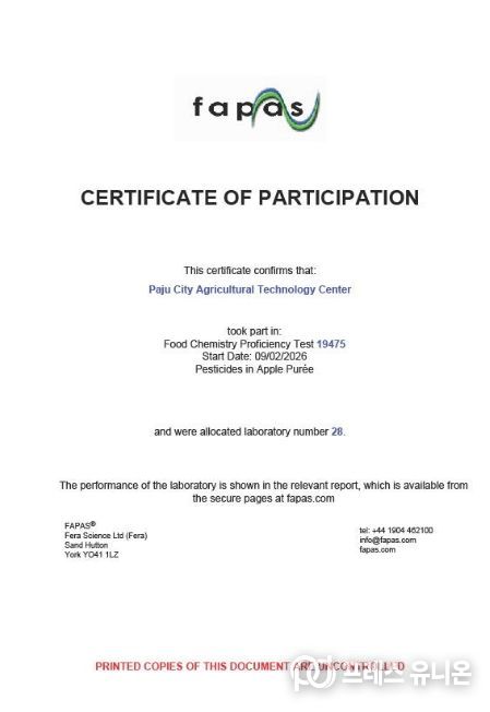 영국 환경식품농림부 식품환경연구청(페라·FERA)이 주관하는 ‘국제분석능력평가’(파파스·FAPAS)는 전 세계 공인 분석기관들이 동일한 시료를 분석해 그 정확도를 상호 비교하는 권위 있는 평가 프로그램이다. 전 세계 60개 기관이 참여한 올해 평가(파파스 19475) 결과, 파주시 농산물 안전분석실은 사과 과립즙(퓨레) 시료에 대해 10개 잔류농약 성분을 분석해 제출한 전 항목에서 ‘만족’판정을 획득했다.