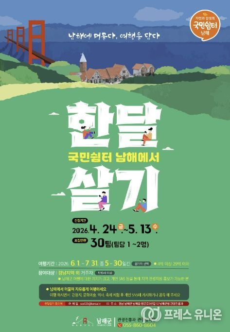 남해군 ‘국민쉼터 남해에서 한 달 살기’는 경남 이외에 거주하는 만19세 이상 국민이면 누구나 참여 가능하며, 자세한 사항은 남해군 홈페이지 공고에서 확인할 수 있다. 남해군 관광진흥과장은 “2026년은 남해군이 체류형 관광지로 한 단계 도약하는 해가 될 것”이라며, “국민쉼터 남해에서 한 달 살기를 통해 더 많은 분들이 남해군의 매력을 깊이 경험하고, 남해와 특별한 인연을 맺는 계기가 됐으면 한다. 앞으로도 남해군을 다시 찾고 싶은 ‘국민고향’으로 만들기 위해 최선을 다하겠다.”고 밝혔다.