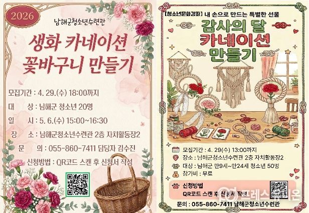 프레스유니온 강찬희 기자 | 남해군 청소년수련관은 가정의 달 5월과 어버이날을 맞아 청소년 대상 문화체험 프로그램 ‘카네이션 만들기 원데이클래스’를 운영한다고 밝혔다.