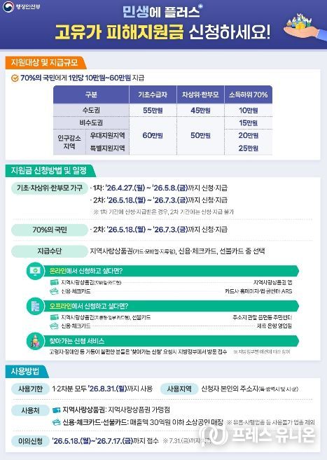 4월 27일부터 5월 8일까지 진행되는 1차 지급 대상은 기초생활수급자, 차상위계층, 저소득 한부모가족이다. 지원 금액은 ▲기초생활수급자 55만 원 ▲차상위계층·저소득 한부모가족 45만 원이다.