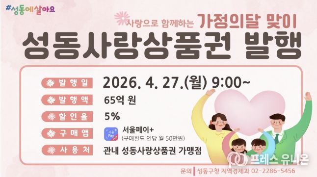 프레스유니온 강찬희 기자 | 서울 성동구는 고물가로 위축된 소비 심리를 회복하고 지역경제에 활력을 불어넣기 위해 총 65억 원 규모의 성동사랑상품권을 추가 발행한다고 밝혔다.