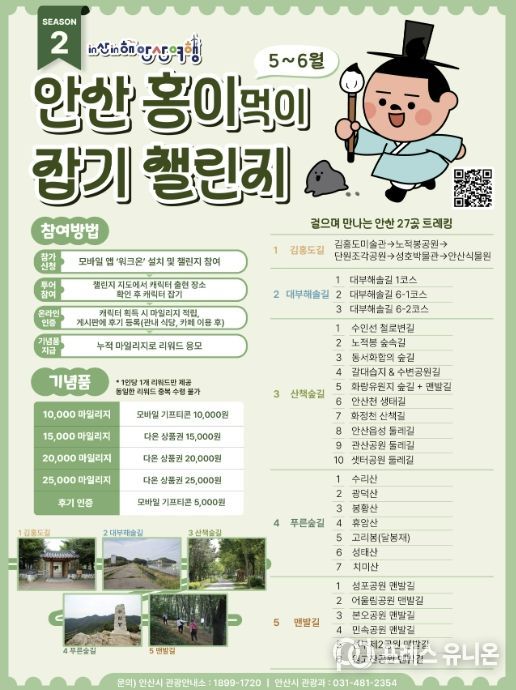 프레스유니온 김성길 기자 | 안산시는 5월부터 6월까지 모바일 앱을 활용해 지역의 걷기 코스를 즐길 수 있는 ‘in산in해 안산여행 캐릭터잡기 챌린지’ 2회차를 운영한다고 27일 밝혔다.